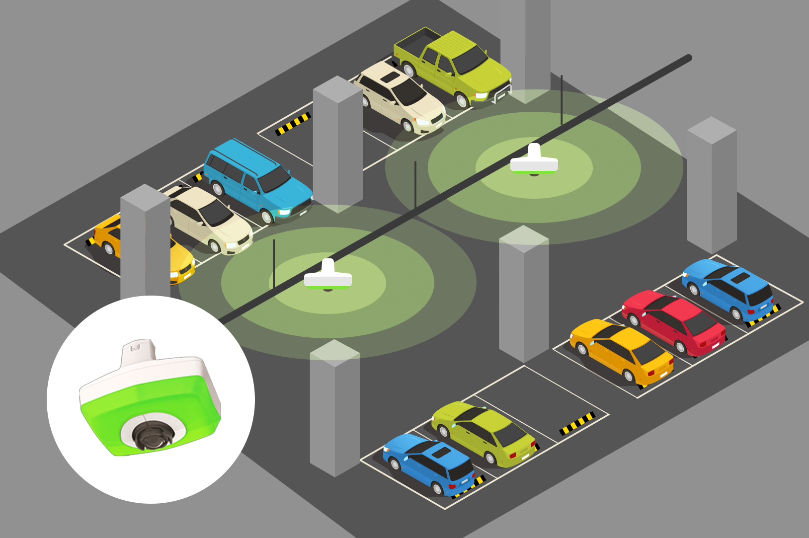 운전자에게 실시간으로 빈 주차 공간의 위치를 안내하는 유도 시스템입니다. 빈 주차면을 찾기 쉽도록 운전자에게 시각적으로 안내합니다.